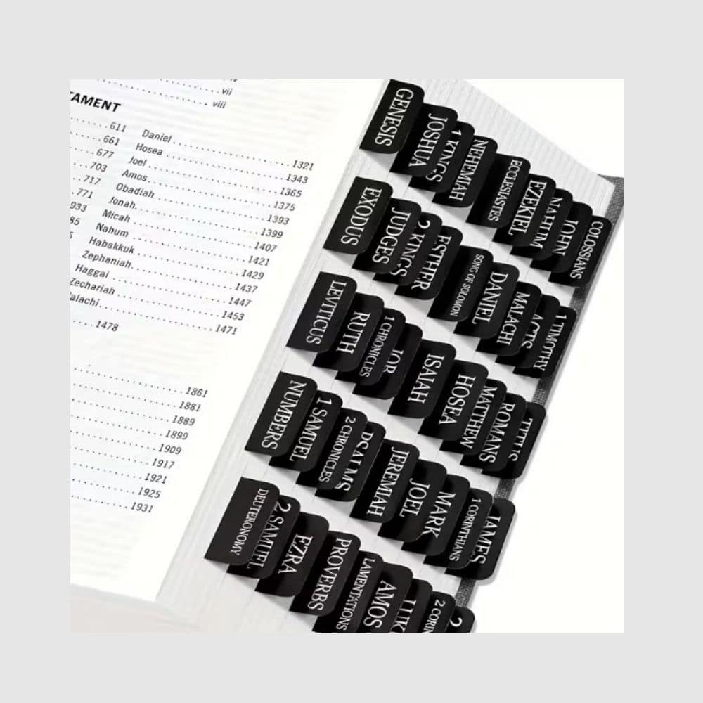 Black with white print Bible Chapter Tabs.