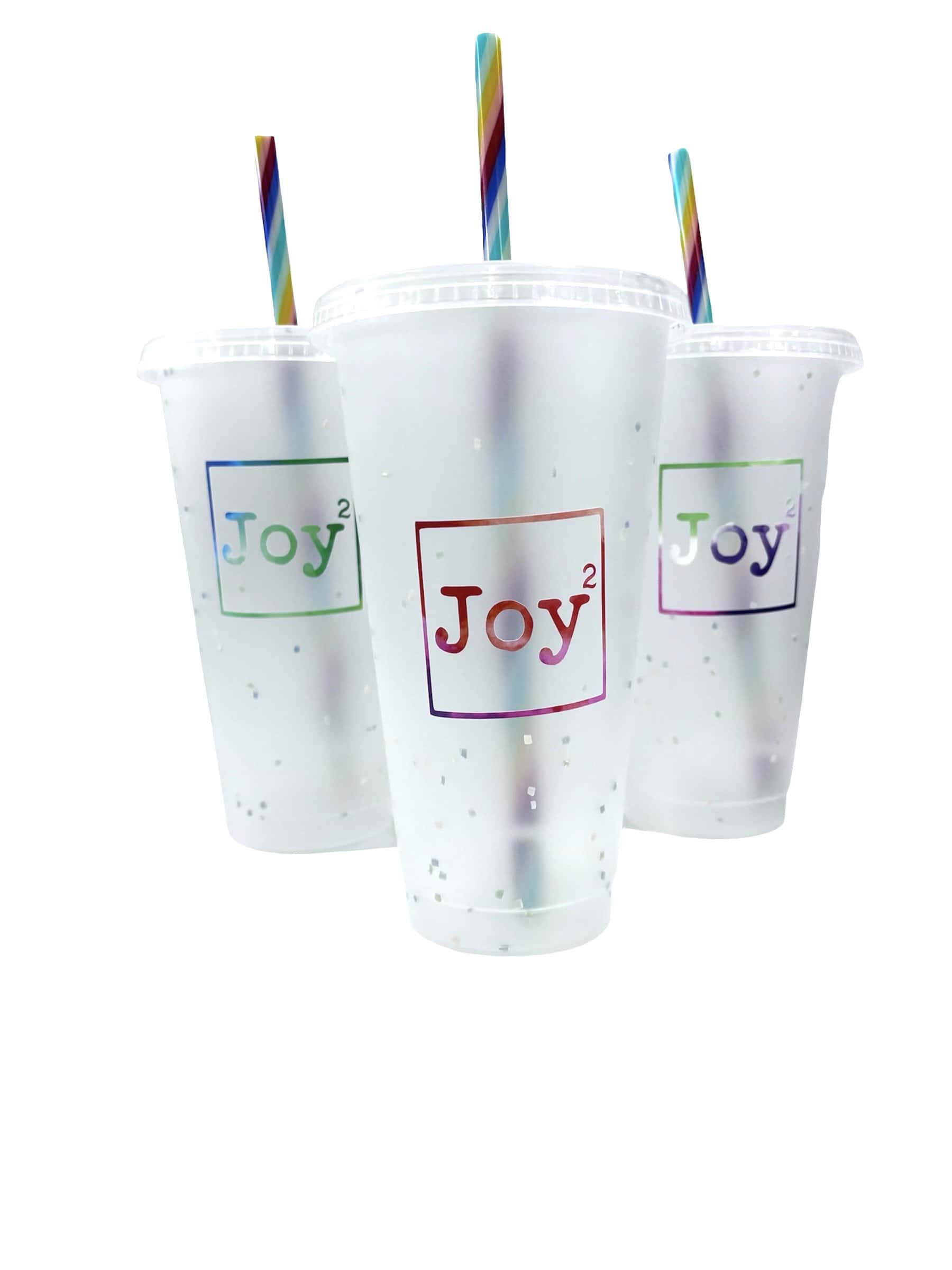 Our clear cups are sprinkled with colouful rainbowy confetti and the Joy Squared Logo. Cups are randomly packed so Logo colours will vary. NO colour choice is possible so you get what you get and you don’t get upset. (Remember that fun saying from Elementary school)?